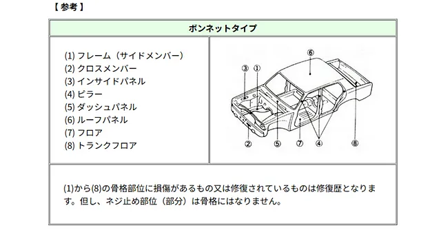 修復歴とは、車の骨格(フレーム)部分にダメージを受け、それを修理または交換した経歴がある車ということになります。